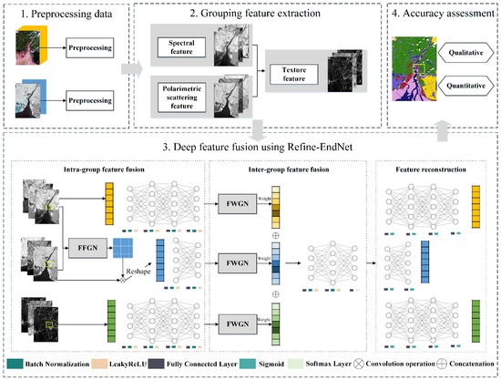 In this study, our proposed method follows an encoder–decoder framework that contains many fully connected neural networks. Figure 1 illustrates the flowchart of deep feature fusion using Refine-EndNet. Firstly, the spectral, texture, polarization, and scattering information are extracted from hyperspectral and SAR data that are preprocessed. Grouping these features and putting them into encoder layers that contain three branches separately, the intra-group feature is extracted deep abstract information and fused preliminarily by encoder layers in the feature dimension. The FFGN that follows a dynamic filter network is embedded into one of the branches to suppress the presence of speckle noise. Furthermore, the FWGN adds weight to optimize the grouping feature and combines the bottleneck to carry out inter-group feature fusion. The output of the bottleneck is the input of decoder layers and produces a label map. Lastly, the label map is evaluated from qualitative and quantitative aspects.