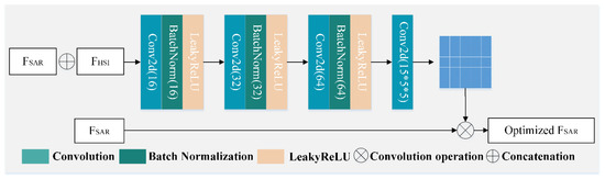 The dynamic filter network dynamically generates a filter based on input data, which has adaptability and flexibility and can realize local space conversion and adaptive feature extraction [32]. The generated dynamic filter does not share the weight among all pixels in the image, which is different from the standard convolution filter. Xu et al. believed that combining a dynamic filter network could effectively reduce the influence of speckle noise in SAR images [33]. Accordingly, hyperspectral and SAR data are concatenated together in feature dimension (, which is token as input. Pre-fusion is carried out through a dynamic filter network to realize the information interaction. Figure 2 illustrates the details of FFGN. In Figure 2, the fusion filter is generated by a dynamic filter network, wherein , and it is reshaped into a dynamic convolution filter with a size of 5 5. As shown in Equation (1), keep convolution operation with each pixel position of to optimize SAR data, and reduce the impact of heterogeneity with hyperspectral data.