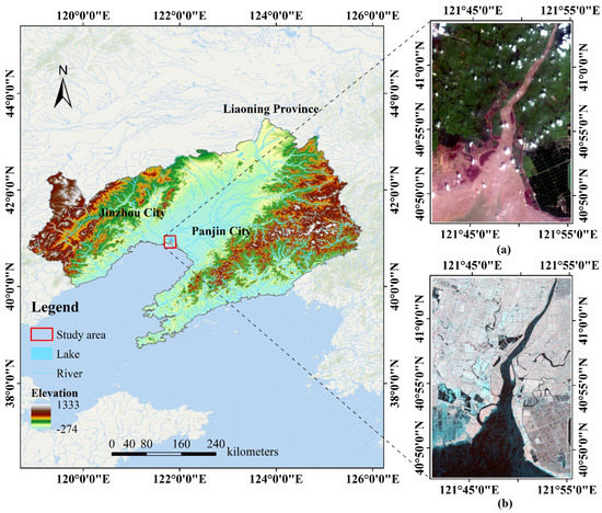 Location of Panjin City, Liaoning Province in China, and the location of the study area: (a) the hyperspectral image (from Chinese ZY1−02D satellite, red = band 29; green = band 19; blue = band 10) and (b) the SAR image (from Sentinel−1A satellite, Pauli RGB) of the study area.