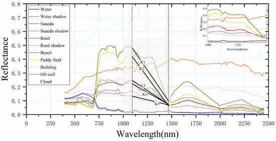 According to the rich geometric characteristics of the hyperspectral reflectance curve, the differences between vegetation under the shadows and vegetation in the bright area are further explored based on the NDVI, to improve the separability between the shadows and the salt marsh vegetation. Figure 5 illustrates the spectral characteristic curves of main land cover types in the study area, where the reflectance of vegetation under the shadows is much lower than the vegetation in the bright area at the near-infrared band. As shown in Figure 5, the reflectance of reed under the shadow is similar to suaeda in the bright area. Specially, the difference is greatest at 1089.23 nm and 1475.86 nm is the strong absorption position of all vegetation spectral curves. Therefore, the slope in these two spectral intervals can suppress vegetation information under shadows and highlight vegetation information in the bright area. Moreover, NDVI can effectively distinguish water from vegetation. In addition, slope can also effectively suppress non-vegetation objects such as buildings and clouds, while the red vegetation has the maximum reflectance in the red band. The hyperspectral shadow vegetation index (HSVI) Equation (7) is proposed to achieve reed > paddy field > suaeda > vegetation under the shadow. Figure 6 shows the comparison between NDVI and the proposed index, which can effectively distinguish the three types of vegetation from the shadows.