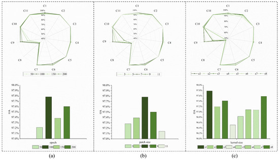 The comparison results of each category of classification accuracy and overall classification accuracy under different schemes: (a) comparison of different epochs, (b) comparison of different patch sizes, and (c) comparison of different convolution kernel sizes.