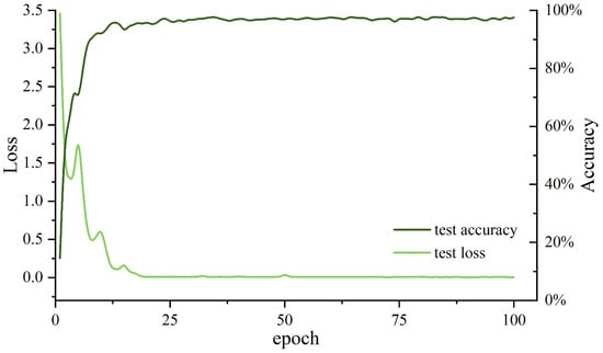 Overall, we select the epochs of 100, a patch size of 7 × 7, and a convolution kernel size of 1 × 1 as hyperparameters to train our proposed deep feature fusion model. The training curves consist of test loss and test accuracy are shown in Figure 8.