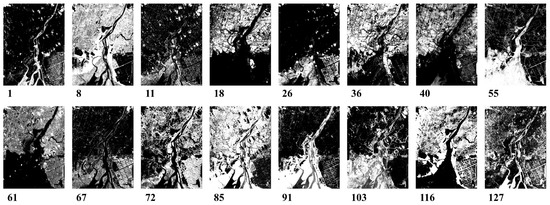 The fusion feature is visualized to investigate the effect of our proposed method. As shown in Figure 9, we select 16 representative feature maps of inter-group features with 128 dimensions. They have different emphases, which can be roughly divided in-to three aspects. Numbers 1, 18, 26, 55, 85, and 103 focus on the special characteristics of single or similar ground objects. Numbers 8, 36, 40, 67, 72, 91, and 116 concentrate on the information of ground object details. Numbers 11, 61, and 117 focus on the identification of texture information of ground objects. All feature maps include clouds and shadows without speckle noise. Therefore, the heterogeneity of hyperspectral and SAR data is well eliminated, and the influence of speckle noise on ground object classification is suppressed. The spectral, texture, polarization, and scattering information de-rived from the two multimodal data sources are used comprehensively, and the abstract information representation is generated.