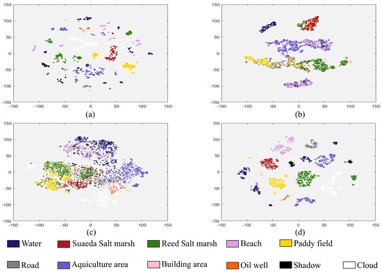 The separability of different ground objects in Liao River Estuary National Nature Reserve under the grouping of spectral, texture, polarization, scattering features, and fusion features is visualized by the T-NSE algorithm [47] (shown in Figure 10). Among them, the different categories under fusion features can be distinguished best, and the sample points of the same category are clustered closely relative to the different categories under spectral features, polarization scattering features, and texture features. Therefore, our proposed method can improve the separability between the categories of ground objects.