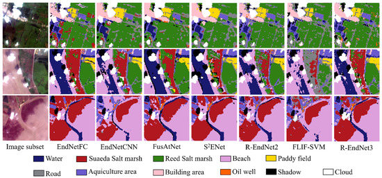 Figure 11 demonstrates the comparison of classification effects of different methods in this study. As shown in Figure 11a,e,g, from the perspective of the overall visual effect, due to the injection of hyperspectral information and consideration of context information, the fusion of hyperspectral and SAR data through the encoder–decoder framework can suppress the speckle noise existing in SAR data to a certain extent. The injection of backscattered information also improves the separability of hyperspectral data between water and vegetation. In terms of local visual effects, the classification map obtained from EndNets is the poorest in complex scenes due to the limited fusion capacity, but the details of ground objects are maintained well (as shown in the first line in Figure 12). FusAtNet and S2ENet have poor classification effects in areas with dense shadows of cloud (as shown in the second line in Figure 12), and cannot effectively distinguish between water bodies and shadows (as shown in the third line in Figure 12). The FLIF-SVM had the worst classification map in the mixed growth area of reed and suaeda, and could not effectively identify water bodies (as shown in the second and third lines of Figure 12). Refine-EndNet maintains the ability of EndNet-FC that can distinguish the details of ground objects while achieving an excellent classification map in complex scenes, especially in areas where reeds and suaeda, water, and shadows mix and intervein.