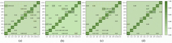Separability of 11 types of ground objects under: (a) spectral feature, (b) polarimetric and scattering feature, (c) texture feature, and (d) fusion feature.