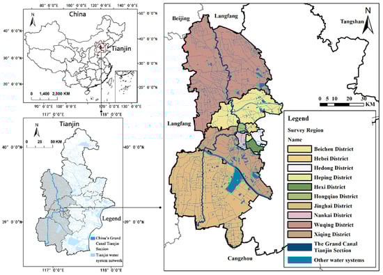 Seated between 38°34′ and 40°15′ in the northern latitude and between 116°43′ and 118°4′ in the east longitude, on the northeast of the North China Plain, at the lower reaches of the Haihe River Basin, bordering on the Bohai River in the east, Yanshan Mountain in the north and Beijing in the west, Tianjin is a central city of China, the largest harbor city in the north, a strategic fulcrum of the Maritime Silk Road and the intersection of the “Belt and Road”. The survey region includes the South Canal and the North Canal at the Grand Canal Tianjin Section, stretches totally up to 195.5 km and runs through seven districts in Tianjin, namely, Wuqing District, Beichen District, Hebei District, Hongqiao District, Nankai District, Xiqing District and Jinghai District, where city, town and rural settlements densely dot (Figure 1).
