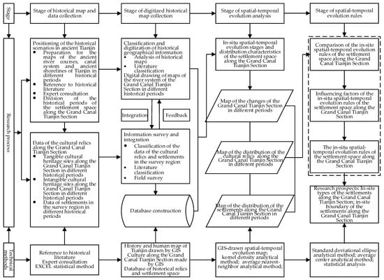 The research thinking of the in-situ spatial-temporal evolution of the settlement space along the Grand Canal Tianjin Section is shown in Figure 2.