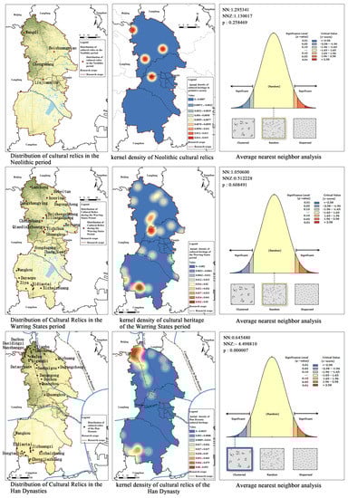 In the Warring States period, because the Yellow River flew into the sea via Tianjin and large quantities of sand bolstered the landform, the Tianjin Plain became a fertile land with robust economic growth. According to the survey, the relics of the Warring States period increased from more than 10 in the Western Zhou Dynasty to 98, including 2 townsites, 80 settlement sites and 16 tombs [35]. There are 28 cultural relics in the survey region. According to the kernel density of the cultural relics (Figure 5), the high-value zone chiefly is composed of Huangzhuan Village, Yangcun Town, Gaocun Village, Chengguan Village, Daliang Village, Hebei Village and Cuihuangkou Town in Wuqing District, Shuangkou Town, Beicang Town and Dazhangzhuang Town in Beichen District, Xinkou Town and Zhangjiawo Town in Xiqing District and Wangkou Town, Ziya Town, Wangcun Town, Chenguantun Town and Xizhaizhuang Town in Jinghai District. The average nearest-neighbor analysis result indicates that the nearest-neighbor rate is 1.05, the z score is 0.51 and the cultural relics of the Han Dynasty are in “random” distribution. Historical data records that the low-lying ancient ruins in Xidiaotai Village in Jinghai District were Pingshu, a northwest border town of the Qi State where a great number of wells were spotted and an enormous amount of construction materials like pan tiles, round tiles, eaves tiles and pottery shards were unearthed [35]; numerous cultural relics were unearthed in Lancheng Village and Beicang Town, manifesting the rapid social and economic growth of the survey region in the Warring States period.