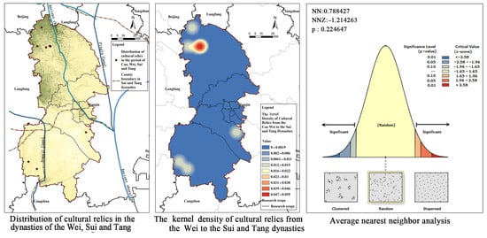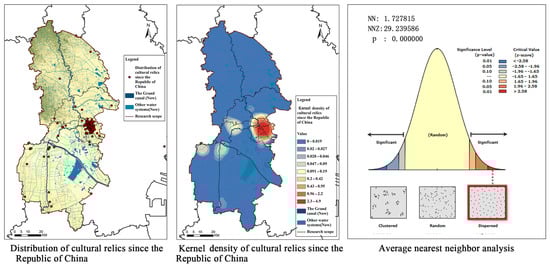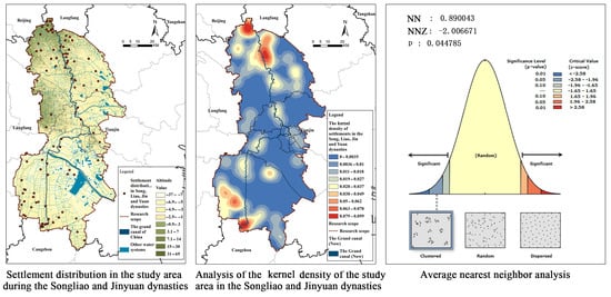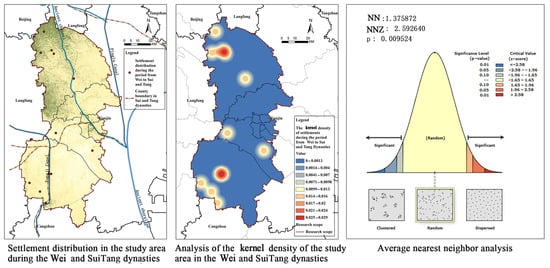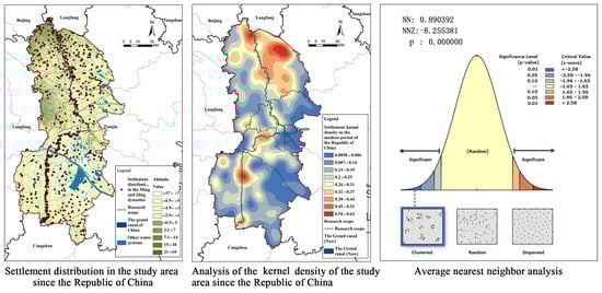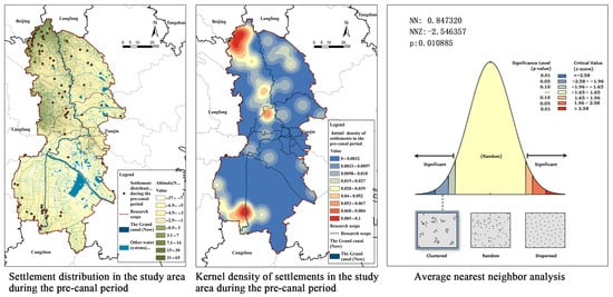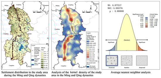 The third step is the stage of spatial-temporal evolution analysis which can be divided into the stages to analyze the spatial-temporal evolution and distribution characteristics of the settlement space and the in-situ spatial-temporal evolution rules of the settlement space along the Grand Canal Tianjin Section. GISMAP has been applied to draw the maps of the changes of the Grand Canal Tianjin Section and the distribution of the cultural relics and settlements along the canal in different periods. The HGIS analytical method, the kernel density estimation method and the average nearest-neighbor index method can profoundly analyze the evolution characteristics of the cultural relics and settlements [25].