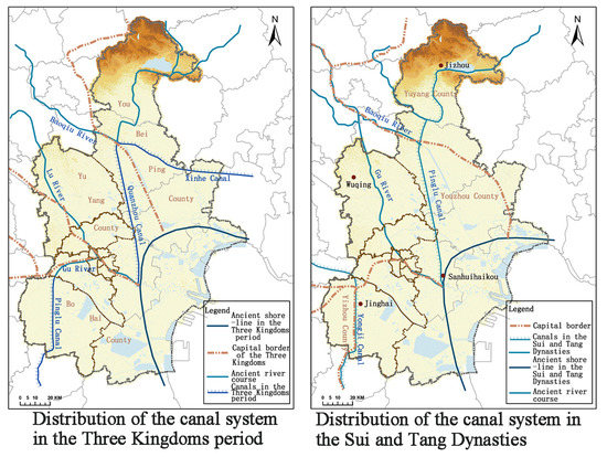 The digging of the Grand Canal Tianjin Section can stretch back to the Eastern Han and Wei Dynasties at the earliest. For military needs, three artificial canals, namely, the Pinglu Canal, Quanzhou Canal and Xinhe Canal, were dug there to transport grain (Figure 7) [37]. The opening of the three artificial transportation canals could defend the western and eastern parts of Liaoning Province and implement the military strategies of connecting with Hebei Plain [37]. These canals surrounded the western and northern parts of the Bohai Bay, cut through Tianjin Plain and linked the Luanhe River and the Central Plain River system with the Yellow River in the center, which was a pioneering work in the history of Chinese canals. To stabilize this unification, the Sui Dynasty spared no efforts to dig the canal and linked the South Canal and the North Canal on the basis of dredging, changing and expanding the previous canals [37]. The Haihe river system in Tianjin was reshaped due to the digging of the Yongji Canal. In 608, Emperor Yang of the Sui Dynasty ordered the digging of the Yongji Canal which ran past the present Duliu Town in Jinghai County, then westwards and finally to Beijing via Xin’an Town, Yongqing County and Anci District, etc. The Yongji Canal was a northern trunk of the canal system in the Sui Dynasty and the main river course to transport army provisions and supplies for northern frontier defense in the Tang Dynasty. The digging and control of the canal mostly referred to dredging and mending in the Tang Dynasty. The Quanzhou Canal was redug for military needs to link Yuyang County and Junliangcheng Town and was renamed Pinglu Canal. The canal digging in Tianjin facilitated the development and prosperity of the cities and rural settlements along the canals.