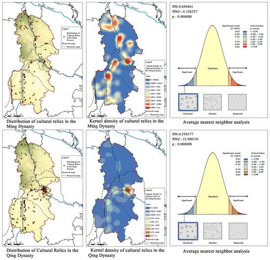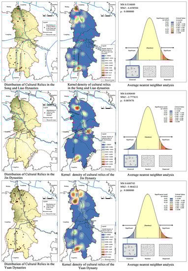 Zhigu Village at the Sancha River Estuary in the Jin Dynasty built walls and boasted more than 5000 soldiers, making Tianjin a pivotal military town. A massive number of ancient wastelands were built into villages. Totally, 22 cultural relics of the Jin Dynasty were discovered in the survey region, including two ancient architectures, 14 ancient sites, one ancient tomb, one irrigation facility and four river course relics, 33 of which are in Wuqing District, 21 in Jinghai District and two in Xiqing District. As the kernel density analysis displays (Figure 11), the high-value area is chiefly in Damengzhuang Town, Baigutun Town and Sicundian Town in Wuqing District, Tangguantun Town and Xizhaizhuang Town in Jinghai District, Hongqiao District and Hebei District in the city center. The average nearest-neighbor analysis result indicates that the nearest-neighbor rate is 0.69, the z score is −2.78 and the cultural relics of the Jin Dynasty are in random “belt + multikernel” distribution.
