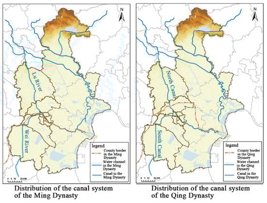 A strictly graded grain transportation management system was implemented in Tianjin in the Ming and Qing Dynasties. The managing officials principally included high-ranking officials and officials of the prefectures, states and counties. High-ranking officials were not included in the authorized size of the government body in the early Ming Dynasty. It was in the middle Ming Dynasty that the officials in charge of the canal were included in the authorized size of the government body. An official of the Ministry of Works in feudal China was in charge of the river course [47]. In the Qing Dynasty, high-ranking officials in charge of grain transportation were chiefly called Censor of Grain Transportation. Different censors of grain transportation were in charge of the South Canal and the North Canal in different places in different periods. Many positions of military officials were set besides the grassroots officials, for instance, Head of Sanliqian Village, Head of Wangjiawu Village and Head of Kuangergang. In the Ming and Qing Dynasties, apart from the officials specially in charge of grain transportation, plentiful organizations in charge of dredging silt (called “qianpu”) and servants were set along the canal for specific canal maintenance. These organizations scattered in the settlements and the servants were composed of the residents and soldiers on both banks of the canal. There are many qianpus in the settlements along the North Canal, like Dasanliqian, Xiaosanliqian, Mengcun, Baimiao, Laomidian, Dingzigu, Yangcun Town, Nancaicun Town, Beicaicun Town and Yinerwan Town; there are also qianpus in the settlements along the South Canal, including Xiaozhigu Town, Yangliuqing Town, Shawo Town, Duliu Town, Diaotai Town, Xinkou Town, Shaozhikou Town and Zaicheng Town. The strict management system further accelerated the development of the settlements along the canal. The rigorous grain transportation management system further stimulated the reproduction and development of the settlements along the canal and the formation of the settlements to “dig and dredge canals for irrigation” for grain transportation.