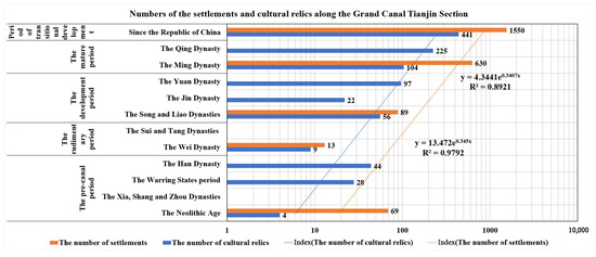 The plain where Tianjin is located was formed below the sea level of the transgression in the recent epoch. In a low-lying terrain, most parts of the area stay at an altitude below 5 m, and the coastal area stays below 3 m, hence vulnerable to the influence of fluctuations of the sea level. The rivers originated at the western and northern sides of Taihang Mountain and Yanshan Mountain and flow into the sea, making Tianjin one of the area’s most densely dotted with rivers. In the period of universal warming of the new epoch 5000–8000 years ago, the Tianjin Plain encountered transgression, and the development of ancient culture was forced to come to an untimely end. It was not until the second transgression in Tianjin in the Han Dynasty that the dense settlements in the Warring States period were all destroyed (Figure 4). The Haihe river system was formed in the late Eastern Han Dynasty, facilitating the digging of the Grand Canal Tianjin Section and the development of the settlements in Tianjin [24].