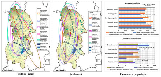 The standard deviational ellipse analytical method creates a standard deviational ellipse to summarize the spatial characteristics, centralized tendency, dispersion and direction tendency of the settlements and cultural relics of the canal. The tool of the standard deviational ellipse creates a new output characteristic including elliptical polygons. The attribute value of these elliptical polygons includes an X coordinate and Y coordinate in the average center, two standard distances (long axis and short axis) and the directions of the ellipses. The computational formula of standard deviational ellipse is: