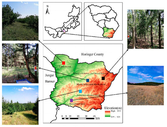 - Wu, D. Study on Water Conservation Function of Different Stands of Public Welfare Forest in Qingshuih County. Master’s Thesis, Inner Mongolia Agricultural University, Hohhot, China, 2019. [Google Scholar]