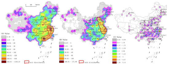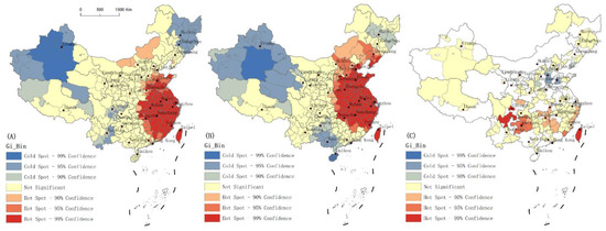 Distribution of hot and cold zones in China’s tourist attractions: (A) national tourist scenic spots, (B) A-level scenic spots, (C) national scenic spots.