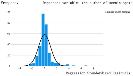 It is not difficult to find from the table that the collinearity diagnosis results (VIF values) of each explanatory variable are less than 7.5, indicating that there is no collinearity relationship among the variables. The Sig. value of each variable was less than 0.05, indicating that each variable had a significant influence on the explanatory model [47]. At the same time, the absolute value of the T value of the explanatory model is far greater than 1.96, which further shows that each explanatory variable has a strong influence on the explanatory model. Finally, the Sig. values of the explanatory models were all found to be 0.000 a in the regression variance test (Table 3), indicating that the explanatory models were of great statistical significance. Moreover, the R2 value of the interpretation model is greater than 0.6, which proves once again that the interpretation model has good robustness, a high fitting degree, and excellent quality. It can be used to explain the main motivation and mechanism behind the absolute number change distribution of tourist attractions in each city. The histogram of regression model residuals also conforms to a normal curve distribution (Figure 4), which further indicates that the regression model has a high degree of fitting and has strong statistical significance, and it can be used to analyze and explain the main factors affecting the spatial distribution of urban tourist attractions. The explanatory model is: