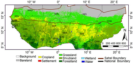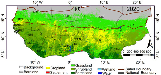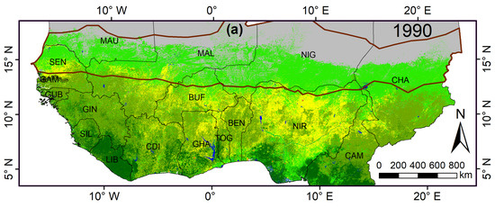 The temporal coverage of the final dataset from 1990 to 2020 covered the whole globe. The datasets from 2011 to 2020 can be obtained from the GEE platform by using the image collection snippet; projects/ee-fgp-annual-4/assets/fgp-annual30_2011–2020. The datasets from the year 1990 to 2020 covering only the Sahel–Sudano–Guinean region in Africa (0° and 30° N) are available at https://doi.org/10.11888/Terre.tpdc.272021 (accessed on August 2021). The analysis in this paper is restricted to the western part of Africa (4° N–18° N and 18° W–24° E) to make the results comparable to the LULC transitions analysis in our previous study [23]. The datasets were generated at five-year intervals. The analysis in this paper was conducted at ten-year (decade) intervals to minimize spurious changes and the inter-annual variability that may be introduced by residual noise in the input time series. The subsequent sections of this paper and the article by Zhao et al. [44] give details of the entire process for the development of the LULC data.