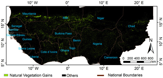 Land Use/Land Cover (LULC) change map of West Africa showing geo-spatial locations of natural vegetation (shrubland, grassland, and forestland) gains during the period of 1990–2020. The new growth excludes intra-categorical transitions between the natural vegetation groups, e.g., shrubland gains from forestland, grassland gains from forestland, shrubland gains from grassland, and vice versa.