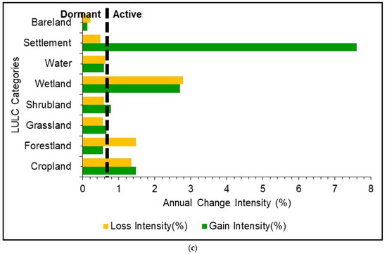 At the category level, settlement, cropland, and wetland both actively gained and lost in 1990–2000. Water bodies actively gained in extent, while the loss intensity was dormant in the same period. During 2000–2010, cropland, grassland, shrubland, and settlement actively gained in extent. The remaining LULC were dormant in gaining, while forestland and wetlands showed some active losses. During 2010–2020, cropland, settlements, and shrubland actively gained, while wetlands actively gained in some areas and actively lost in other areas. The extent of the remaining LULC categories did not change significantly during this period, as they were dormant in gaining and losing at the same time. Settlements showed the highest annual gain intensity, i.e., 5.53%, 2.60%, and 7.60%, respectively, in 1990–2000, 2000–2010, and 2010–2020 (Figure 5 and Figure 6).