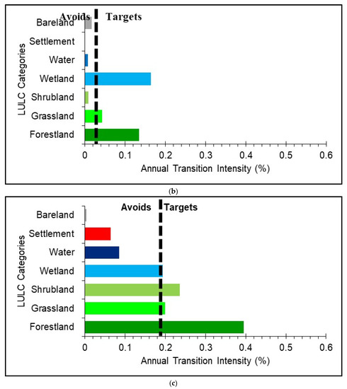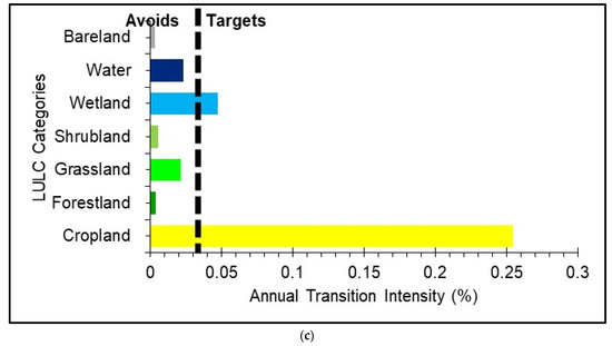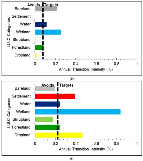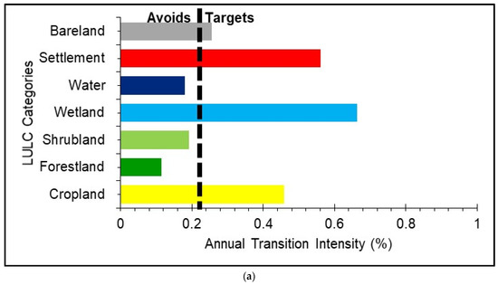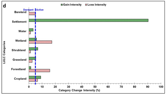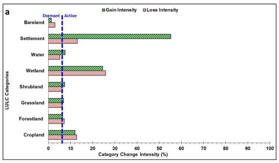 During the three periods, settlements and cropland were active gainers, whilst bare land and forestland were dormant. The gain intensities of these four LULC categories were stationary. The annual gain intensities of the remaining LULC categories were not stationary. Regarding losses, only wetlands were the active loser throughout the entire study period, i.e., stationary. All the other LULC categories were either active losers or dormant losers in one or more periods, i.e., non-stationary (see Figure 5 and Figure 6).