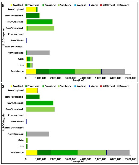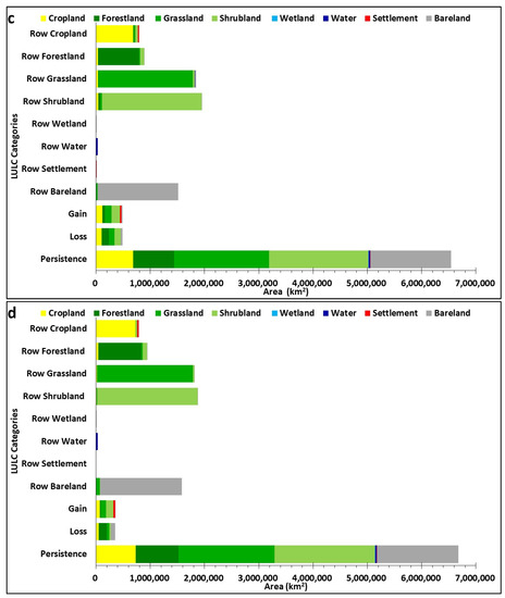 Figure 6 shows the loss and gain intensities of the various LULC categories every 10 years. The sum of the loss and gain intensities, with sign, of each category gives a decadal net change (%). For the entire period (1990–2020), the net change was negative (loss) for forestland, wetland, and bare land. The net change was positive (gain) for the remaining categories, i.e., cropland, settlement, shrubland, and grassland (Table 4). The net gains in rangeland (i.e., shrubland and grassland) are of paramount importance, as previous studies [23,24,25] on the continent detected consistent losses in natural vegetation categories, except for herbaceous vegetation.