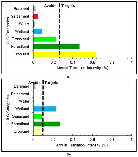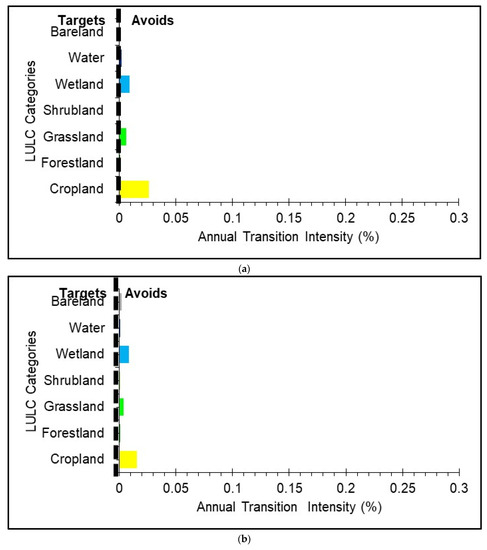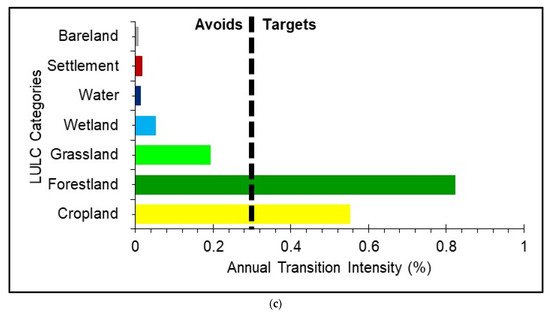 The intensity analysis technique also facilitates the detection of stable transitions, i.e., stationarity of the changes over the time intervals, across categories, and among transitions. Intensity analysis reveals information that provides a foundation to correctly interpret the estimated transitions. Intensity analysis links LULC patterns and processes with underlying drivers and helps us to understand the mechanisms of change. This is necessary in examining the complex interaction between human activities and the environment at different levels of spatial aggregations [32,33,34].