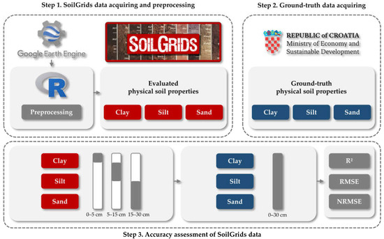 The study workflow for the SoilGrids accuracy analysis in Croatia was divided into three steps: (1) acquisition and preprocessing of SoilGrids data, (2) acquisition of the ground truth soil sampling data, and (3) accuracy assessment of SoilGrids based on the ground truth data (Figure 1). A total of three physical soil properties were evaluated, including clay, silt, and sand soil contents. Despite the availability of several chemical soil properties in the ground truth data, soil texture components were selected for the accuracy assessment of SoilGrids as very stable soil properties [29] with a tendency to remain stable over several years [30,31]. Therefore, the potential effect of temporal discrepancy in the soil sampling was minimized.