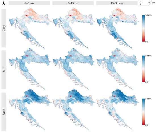 The results of the SoilGrids accuracy evaluation in Croatia based on independent ground truth soil sample data show a low level of accuracy for all three evaluated components of soil texture. Despite low resulting R2 values, the RMSE values were similar to those of the cross-validation as part of the SoilGrids creation process. The main feature of this validation was that SoilGrids used zero soil samples in the study area, based on the ISRIC WoSIS Soil Profile Database. This implies that a similar accuracy for soil texture components in the 0–30 cm soil layer from SoilGrids can be expected in other study areas that were sparsely represented in soil samples during the training process and have a high heterogeneity in terms of landscape and climate properties. Moreover, future global mapping initiatives based on environmental data might encounter similar unevenness in terms of mapping accuracy in areas sparsely represented in the ground truth data. Additionally, the time frames of the field sampling of the ground truth data and data used to create SoilGrids did not match, as the ground truth data represented significantly more recent field data. This study minimized this potential problem by using the most recent official ground truth soil sampling data in Croatia, as well as the most recent SoilGrids data. The minor limitation of this study was a minor discrepancy in the soil sampling depths of the ground truth data (0–30 cm) and the native soil depth of the SoilGrids layers, which were segmented into 0–5 cm, 5–15 cm, and 15–30 cm soil depths. Finally, due to the high heterogeneity of the landscape, climate, and biogeoregions in the study area, the variability in soil texture components in Croatia likely could not be contained in the globally trained SoilGrids data at a 250 m spatial resolution.