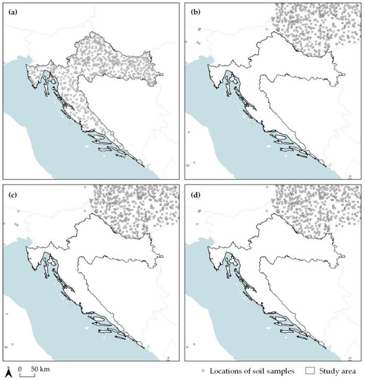 The ground truth soil sampling data were acquired from the openly available web feature service (WFS) provided by the Ministry of Economy and Sustainable Development of the Republic of Croatia [36]. The field soil sampling was performed between April 2015 and October 2016 as a part of the national project “Change in soil carbon stocks and calculation of total nitrogen and soil organic carbon trends and C:N”. The soil sampling methodology was performed according to the “Soil Sampling Protocol to Certify the Changes of Organic Carbon Stock in Mineral Soils Of European Union” by the Joint Research Centre of the European Commission [37]. According to this protocol, soil samples were georeferenced using the global positioning system (GPS) with a positioning accuracy of a few meters and were distributed as point vector data. Each collected soil sample was collected as a composite of 25 soil sampling points within the sampling grid, representing the aggregated value of clay, silt, and sand soil contents in the specified proximity of each point displayed in Figure 2. A total of 686 soil samples at a 0–30 cm soil depth were filtered from the original 725 samples according to land cover classes which included agricultural areas, forests and seminatural areas, and wetlands as per the CORINE classification [38]. Soil samples collected from artificial surfaces were removed from the analysis as SoilGrids did not include soil data in these areas.