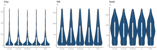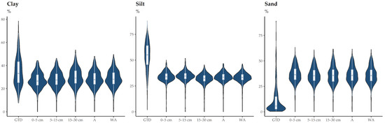 The medians and value ranges of the evaluated SoilGrids layers resulted in high variability in comparison with the ground truth soil sampling data. These are presented in violin plots (Figure 6) containing the density information about the ground truth data and evaluated SoilGrids rasters, as well as boxplots, which indicate the median, minimum, maximum, and first and third quartile values [46]. The median values based on the average of 3 SoilGrids layers per soil parameter differed from the medians of the ground truth data by 19.4%, 64.1%, and 84.5% for clay, silt, and sand, respectively. Moreover, the SoilGrids layers had much lower value ranges for the evaluated soil texture components, with a maximum average clay value of 48.04% (78.51% for the ground truth data) and a maximum average silt value of 46.62% (87.89% for the ground truth data). The values of the SoilGrids layers per soil texture component had similar value ranges regardless of the soil depth.