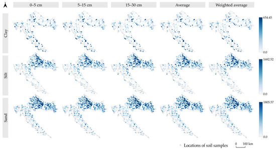 Based on the 686 ground truth soil samples, the SoilGrids layers had a low average accuracy represented as R2, which varied from 0.039 for silt and sand to 0.267 for clay (Table 3). The average NRMSE ranged from 0.362 for clay to 2.553 for sand soil content. Overall, the SoilGrids did not show a tendency for any individual native soil depth to be superior in terms of accuracy, while all soil parameters resulted in slightly higher accuracy for either the 5–15 cm or 15–30 cm layer. The average and weighted average only performed better for clay compared with the most accurate individual layers of evaluated soil parameters. The accuracy of the weighted average values was particularly less affected by the lower accuracy of the 0–5 cm data for silt in comparison with the 5–15 cm and 15–30 cm soil layers. The absolute accuracy represented by the RMSE and NRMSE values and the relative accuracy represented by R2 generally matched in terms of ranking the evaluated SoilGrids layers per soil parameter. A slight exception occurred for clay and sand, which had similar R2, RMSE, and NRMSE values for individual soil layers, but their mutual rankings in terms of absolute and relative accuracy were in disagreement. The accuracy assessment of the native SoilGrids layers according to the Köppen–Geiger climate classes and major CORINE Land Cover 2018 classes is presented in Appendix A. Overall, the Csb climate class resulted in the highest accuracy for all 3 evaluated soil parameters, but its coverage of 1.0% of the study area possibly skewed the results. Among other climate classes, consistently low accuracy was achieved for the temperate Csa class with hot and dry summers. The land cover classes had a minor effect on the accuracy per soil property, while no consistent effect was observed for their respective soil depth layers.
