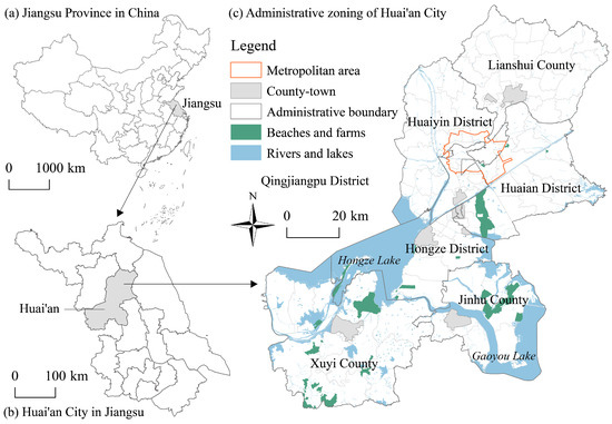 In this paper, the study area is the countryside of Huai’an City, which is located in the north of Jiangsu Province, a developed province in eastern China (Figure 1). However, the three sub-regions of Jiangsu Province, Southern Jiangsu, Central Jiangsu, and Northern Jiangsu, have faced long-term imbalanced development [57]. Since the rise of the Southern Jiangsu Model in the 1980s, the rapidly developing manufacturing industry has created massive employment with substantial wages, leading to a gap between Southern and Northern Jiangsu. In addition, the proximity to Shanghai provides tremendous development opportunities, leading to long-term population loss and unsustainability in Northern Jiangsu, especially in the rural areas [58].