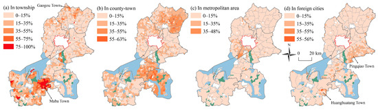 Figure 2 presents the spatial pattern of urban house purchases in different destinations. The villages with high purchase rates in the township were concentrated in areas with strong development levels, such as Maba Town in Xuyi County and Gaogou Town in Lianshui County (Figure 2a). Among them, Gaogou Town had one alcohol company listed on the Shanghai Stock Exchange, while Huai’an had only two A-share-listed companies in 2019. By contrast, Maba Town is located near two highways and is easily accessible from the outside. Figure 2b shows that high house purchase rates in the county town were concentrated around the central built-up areas of Jinhu County, Hongze District, and Lianshui County, which are characterized by a single-core urban system. Figure 2c reveals that rural farmers with better accessibility to metropolitan areas, such as the periphery of Huaiyin District, Qingjiangpu District, and Huai’an District, tended to purchase houses in metropolitan areas. Finally, Figure 2d exposes the tendency of rural households at the edge of Huai’an to purchase houses in foreign cities, such as Huanghuatang Town in Xuyi County and Pingqiao Town in Huai’an District bordering the provincial capital Nanjing.