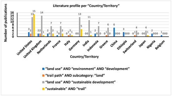 The graphical representation of the conducted literature search, based on the four fields of keywords (a) “land use” AND “environment” AND “development”, (b) “trail path” AND subcategory: “land”, (c) “land use” AND “sustainable development”, and, (d) “sustainable” AND “trail”, as well as the four main domains of (being paired together by two): (a) year and country/territory, and, (b) keyword and subject area, is shown in Figure 1, Figure 2, Figure 3 and Figure 4, below.