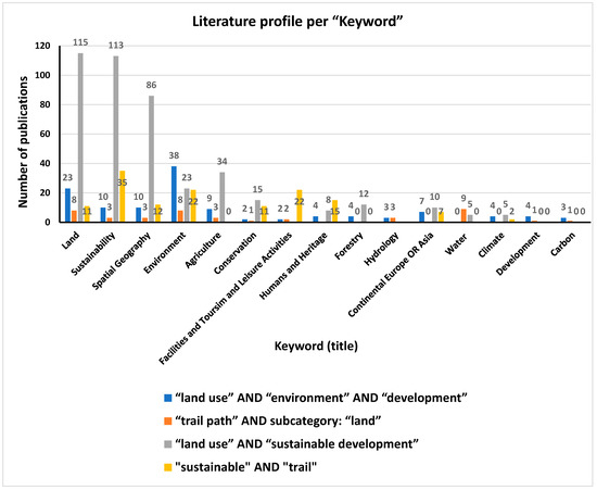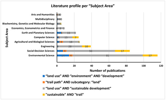 Figure 1 revealed that the two fields of keywords “land use” AND “sustainable development”, as well as that of “sustainable” AND “trail” sustain the higher number of documents reported in the timespan of last four decades, followed by the other two fields of keywords “land use” AND “environment” AND “development”, “trail path” AND subcategory: “land”. This field of keywords has shown a rather recently emerging field of analysis, being also attributed to a shift in everyday living conditions of citizens worldwide towards a healthier lifestyle and constant seeking for personal leisure activities in a clean and greener natural environment. Similarly, based on Figure 2 it was shown that countries of either densely populated (western) economies, or wide spatial areas of management and development (such as that of African and emerging economies) are particularly interested in the joint fields of keywords “land use” AND “sustainable development”, as well as that of “sustainable” AND “trail”, followed by the field of keywords “land use” AND “environment” AND “development”. Contrarily, sporadic and sparsely investigated studies were reported in the field of keywords “trail path” AND subcategory: “land”, being mainly reported in Mediterranean European countries, such as Italy and Greece, being also vulnerable to the concurring economic and energy crises, as well as the COVID 19 pandemic. In Figure 3 and Figure 4 the literature profiles of the retrieved documents per “Subject Area” and “Keyword” are also depicted.