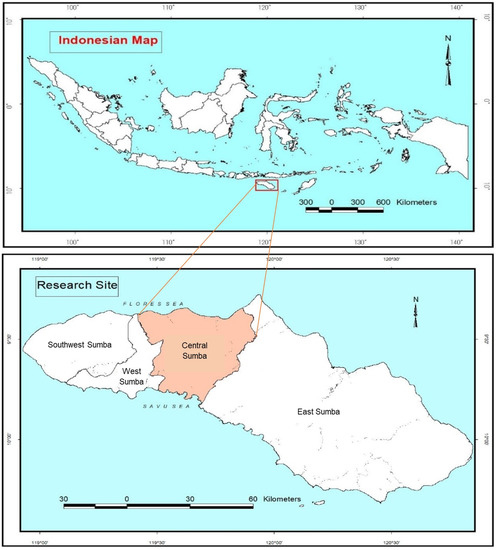 - Central Sumba District Statistical Bureau. Sumba Tengah Dalam Angka 2017 (Central Sumba District in Figures 2017); Central Sumba District Statistical Bureau: Waibakul, Indonesia, 2017. [Google Scholar]