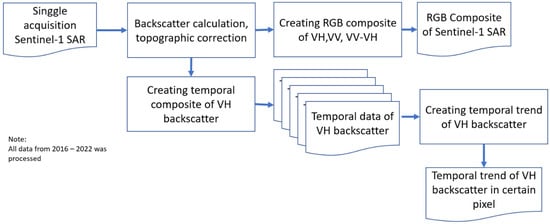 Due to the incomplete availability of Landsat data, in addition to Landsat 8, Sentinel-1 was also used to obtain information on planting frequency every 12 days. For the cropping frequency, Sentinel-1 SAR imagery is used on a single recording (not composite), with RGB composition using bands VV, VH, and VV/VH. Image acquisition took place at planting time, in the first growing season and the second growing season. The goal was to see the growth phase. Using the Sentinel-1 toolbox from ESA (European Space Agency) in Google Earth Engine (GEE) with some processing procedures such as the use of Orbit files, removing thermal noise, removing GRD border noise, radiometric calibration, and range–Doppler terrain correction [51] to ensure the integrity of land change [52,53], a flowchart of the time series data analysis is provided in Figure 2.