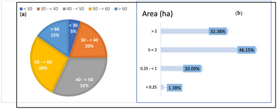 Agricultural land refers to irrigated rice land, rain-fed lowland rice land, and upland farming for mixed food crops. Most respondents own land 1–2 ha—an average of 1.5 ha (Figure 3b). The analysis for rice paddy farming showed that an increase in land size significantly increases rice production (t < 0.000), i.e., every one-hectare increase in land size increases rice production by 1.9 tons.