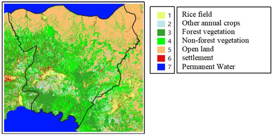 Central Sumba District is one of four districts on Sumba Island and is part of the East Nusa Tenggara Province (EAT), Indonesia. This district was formed in 2006, and is a division area of the West Sumba District [81]. Climatologically, Central Sumba District is classified as a dry area because the amount of annual rainfall is relatively low, less than 1500 mm, and is concentrated in the four wet months from December to March. The characteristics of this dry area are that the local type of agriculture is dry land farming; most people rely on this sector as their economic base. An overview of land cover—specifically paddy fields, other annual crops, forest vegetation, non-forest vegetation, open land, and settlements in this district—is shown in Figure 4.