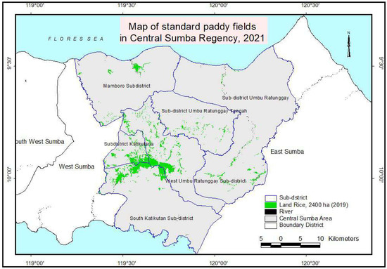 From the picture, it can be seen that the area of paddy fields is 6400 ha, which is spread over 56 out of 65 villages in Central Sumba District. Although these paddy fields are spread over all sub-districts, most of the area comprising rice fields (79%) is concentrated in one area, which includes three sub-districts, namely Umbu Ratu Nggay Barat, Katikutana, and South Katikutana sub-districts.