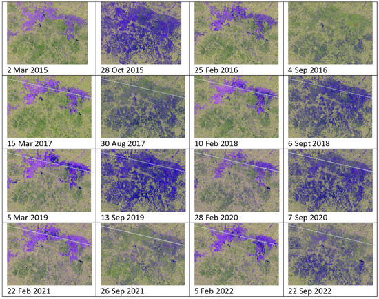 As of 2021, 7-unit deep wells and several large ponds with a capacity of 850,000 m3 have been built to support the Food Estate Program in Central Sumba [85]. From the results of a visual analysis, before and after the construction of the ponds, the area of paddy fields tends to be constant, but the frequency of planting may be greater after the construction of the ponds. The dynamic change in paddy field land cover is shown in Figure 7.