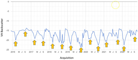 Sentinel-1 imagery data are part of a time series obtained by observing the dynamics of land cover change from November to October of the following year, every year (Figure 7). Figure 8 shows a graph of the trend of rice growth in one of the rice fields in the district studied; in 2017, rice was planted two times in a year in the field, while in 2022, it was planted once in a year. Visually, in 2017 and 2022, there are no significant changes in paddy field and forest land cover.