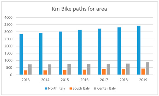 There was a general improvement from 2013 to 2019. There was a 20.8% rise in the northern macro area, from 2839 km in 2013 to 3430 km in 2019. The increase in the center (+18.3%), from 729 to 863 km in this same timeframe, was marginally less (Figure 1). With EUR 400 million allocated to regions and autonomous provinces for the years 2021 to 2026, including 150 million in state funding under current law, the NRRP measures for cycling promotion aim to build tourist cycleways (measure M2C2: Enhancing mobility sub-investment). By 30 June 2026, there must be at least 1235 additional kilometers of tourist cycleways constructed, in addition to any additional funds from the federal, state, local, and local budgets for the components of ongoing projects that must be scheduled and reported on the NRRP. Urban cycleways and works of extensive maintenance are included in the measures for an investment of EUR 200 million for the fiscal years 2022 to 2026, of which 50 million is public money under current law (measure M2C2: Improving mobility). The funds are designated to the improvement of cycling accessibility, namely to build an extra 565 km of urban and metro lines in locations with significant university populations and connecting them to rail or metropolitan hubs. By 31 December 2023, 200 km more of urban and metropolitan bicycle lanes are expected to be built, with another 365 km by 30 June.