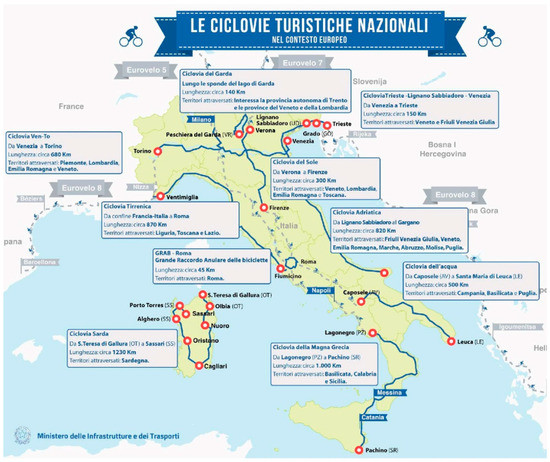 - Italian Minister of Infrastructure and Transport. Ciclovie Turistiche Nazionali. 2022. Available online: https://www.mit.gov.it/connettere-litalia/ciclovie-turistiche-nazionali (accessed on 8 May 2023).