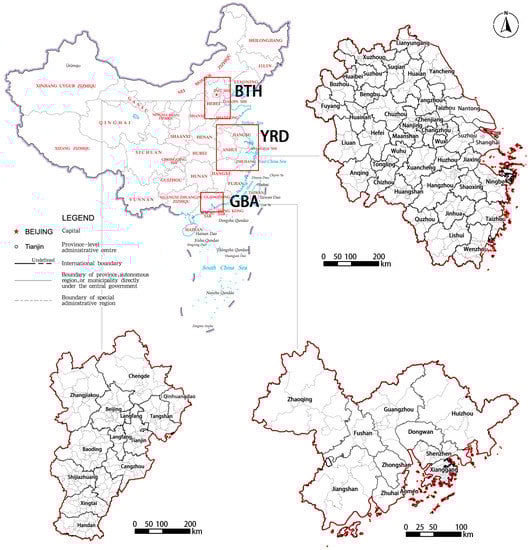 Beijing–Tianjin–Hebei (BTH) Urban Agglomeration, Yangtze River Delta (YRD) Urban Agglomeration, Guangdong–Hong Kong–Macao Greater Bay Area (GBA), China.