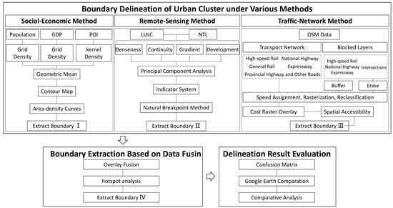 The study proposes an identification method based on multi-source data that combines various attributes of urban clusters to achieve a comprehensive delineation and enable comparison of results. By fusing data from different sources, the method can effectively reflect the unique characteristics of each dataset, thereby improving data efficiency and efficacy. This approach can also facilitate a deeper understanding of the target region. First, this study employs three distinct technical routes to identify the boundaries of urban clusters in three major urban agglomerations from multiple perspectives. These include the SEM (based on the density threshold curve of population, GDP, and POI distribution), the RSM (based on the characteristic indicators of density, contiguity, gradient, and development), and the TNM (based on the isochrone map of traffic accessibility). Second, the results obtained from the three methods are overlayed, and the hotspot analysis method is applied to detect areas with a high value of the characteristic index of urban clusters. Finally, the differences between the boundaries delineated by the four methods are compared, and the objectivity and scientific rigor of each method are evaluated using the built-up area dataset of Chinese cities in 2020, combined with a confusion matrix. The technical routes followed in this study are illustrated in Figure 2.