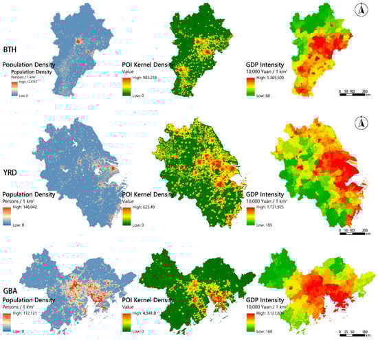 The Spatial pattern of population density, POI kernel density, and GDP intensity.