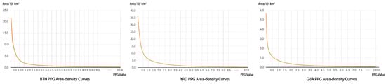 To determine the spatial distribution of the PPG index density threshold, we employed a density-based curvilinear threshold method. This involved quantifying the thresholds of urban cluster boundaries for different regions at a consistent scale, using dynamic density analysis. We constructed area–density curves to analyze the distribution of the normalized index. By extracting the change in area enclosed by the index and the corresponding contour, we identified the threshold value of the index that indicates a significant change in within a certain density range, from dense to sparse. This threshold value was then used to determine the boundaries of urban clusters [].